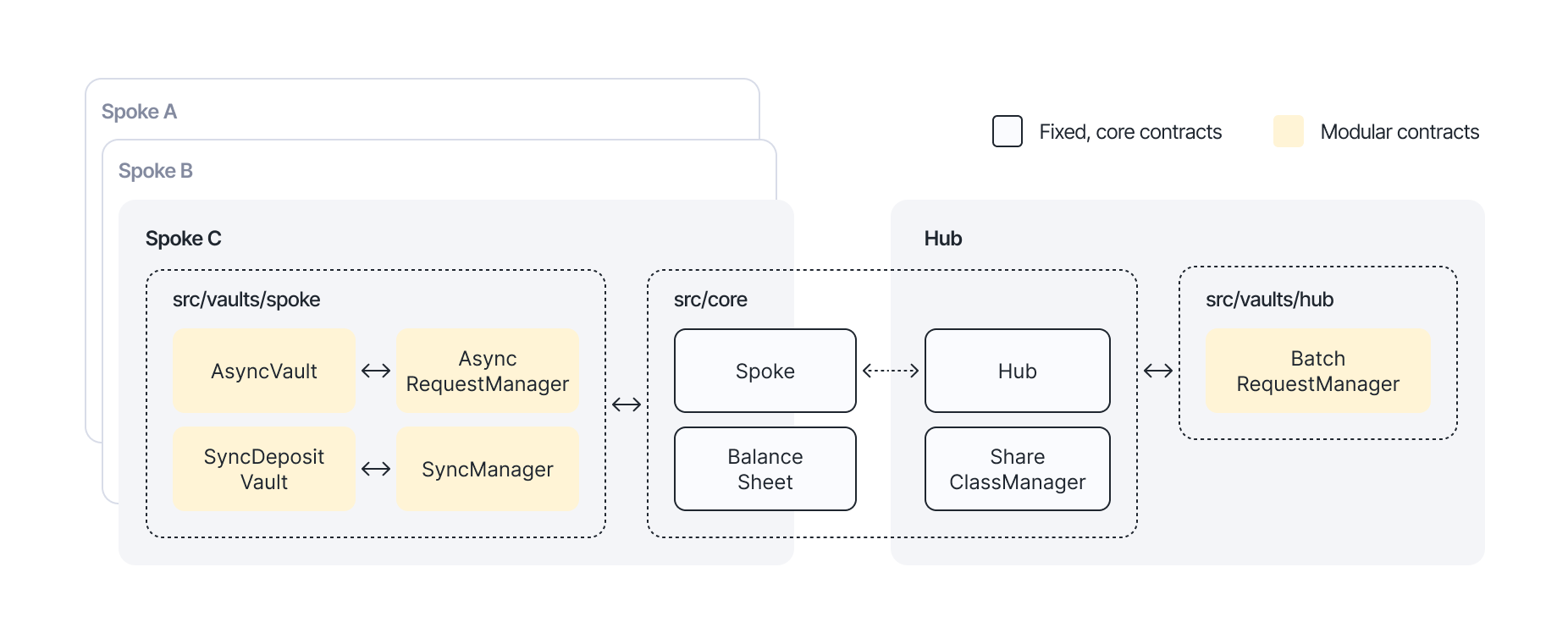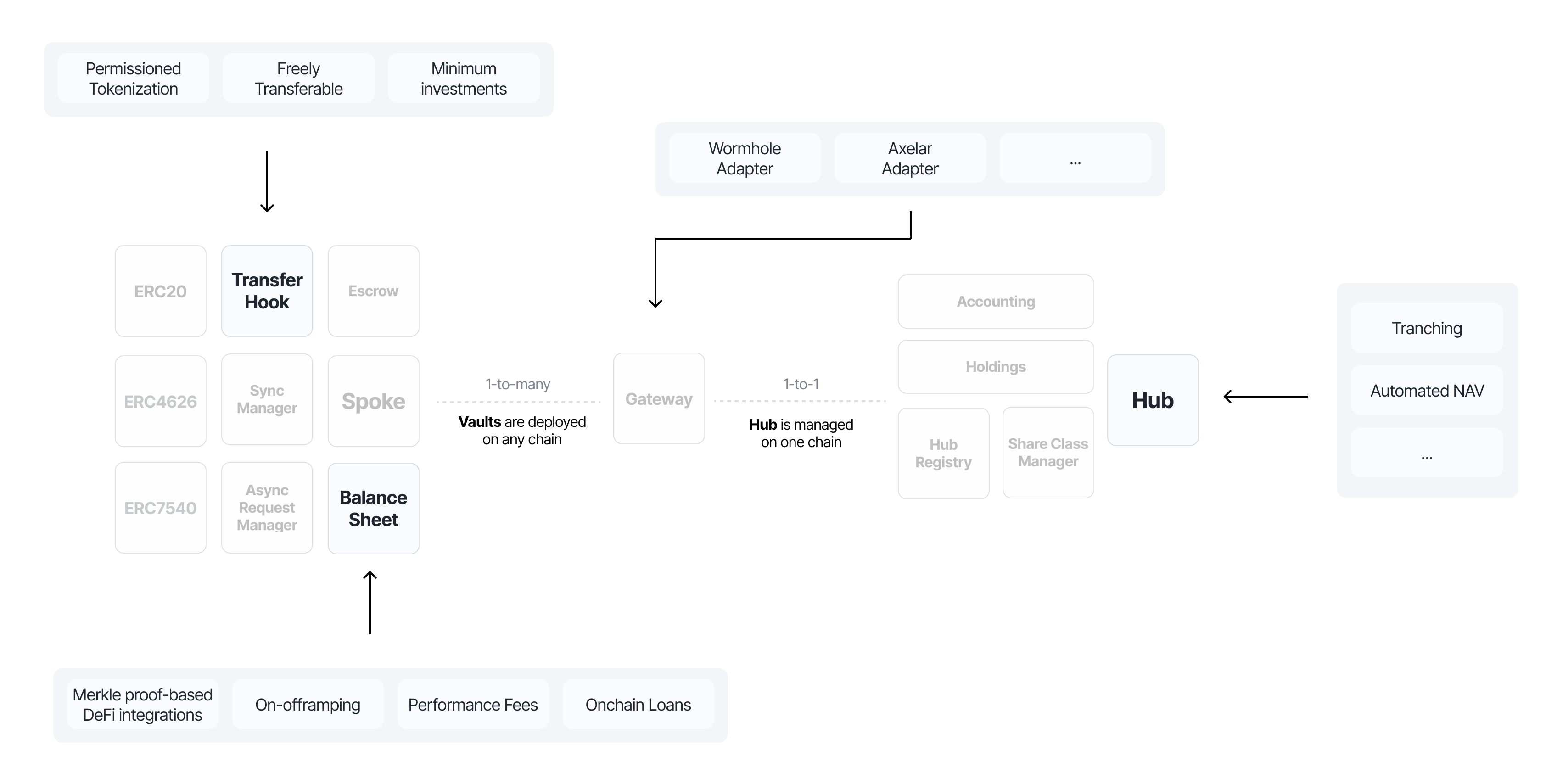 The Hub is the central smart contract responsible for managing Net Asset Value (NAV) calculations, investor share class logic, and fund-level mechanics. Using Hub Managers, developers can define custom logic for: