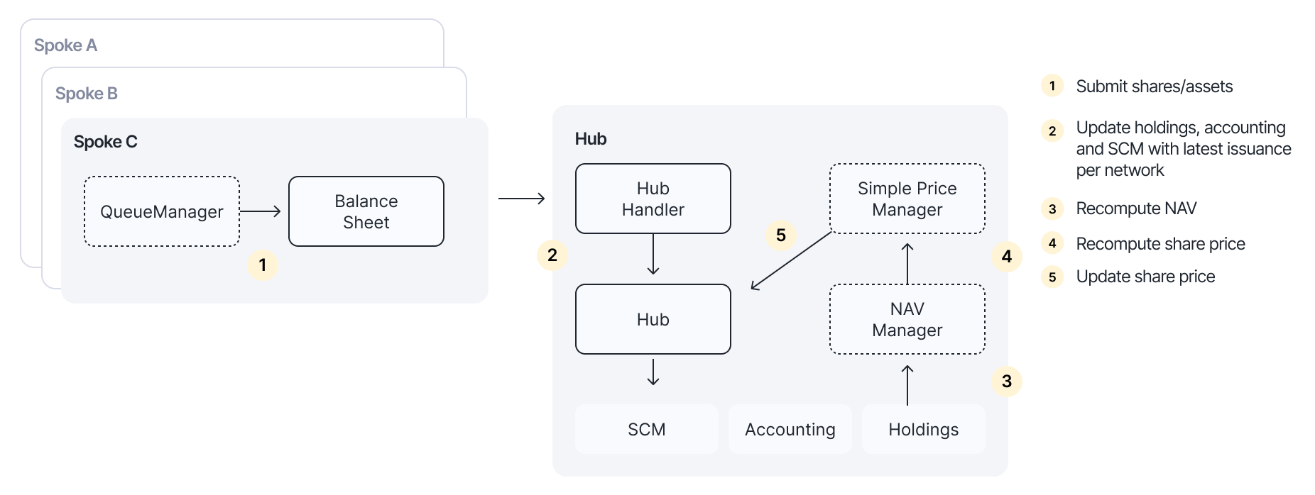 Investments are submitted on each chain (Spokes), minting new shares and depositing ERC20 tokens into the balance sheet. The Queue Manager smart contract enables automatically submitting batches of investment updates cross-chain to the pool manager on the Hub chain.