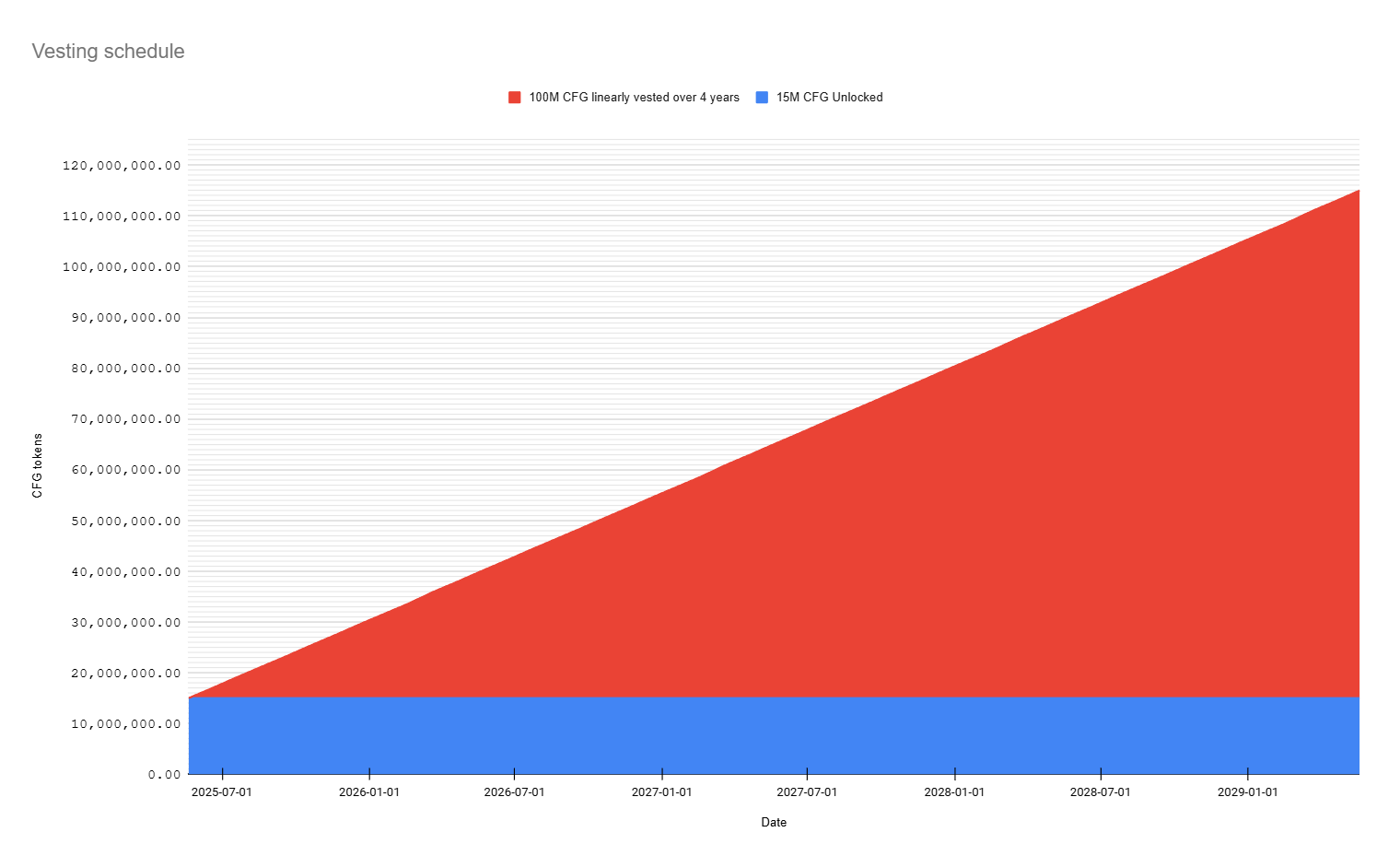 - 100,000,000 CFG will be linearly vested over a four-year period, starting from May 20, 2025. These tokens will be gradually released to align incentives and promote long-term growth of the protocol.